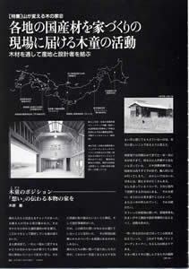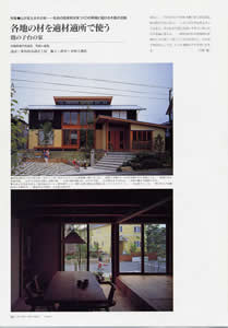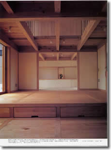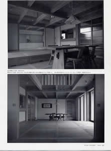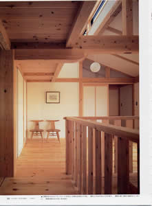 | 彼ほど,一戸の住宅に 木材を大量に使う 設計者は, 私の周りにはいない. しかしそれが出来上がっ てみると, 木があまり自己主張しすぎていない の が 不思議に思える. 一般並材の杉を彼独特の 組みにより 美しく現しているのを見ると, 木を出 す側の私としては, いつも溜飲の下がる思いがす る. (木原巌) |