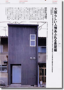 | 『小路の長屋』がある場所は、 戦後建てられた間口一間半 .二間の長屋が建ち並ぷ下町 だ。関西にはこういった長屋 タイプの敷地が非常に多いの だが、建築家・緒方さんが依 頼された物件も、そんな四軒 長屋のちょうど真ん中にあた る家だった。その敷地の形状 は建築家なかせのいわゆる鰻 の寝床。緒方さんはとにかく 家に広がり″ を出そうとし て、様々なアイデアを捻出し、 一つ一つをクリアしていった。 |