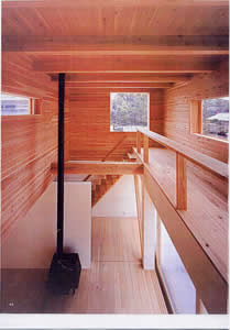 | 由な使い方だ。床から天井ま での窓もこの住宅の自由な性 格を表しているかのようだ。 「この家は一見R C のような 豪ですが木造です。イメージ としては木の塊にしたかった んです。普通の木造は柱があ って、その間が何かで仕上げ てあるという感じですが、生 地の間に左官が塗ってあかと いうよりも土の壁とか木の塊 とか、要素を分けていったほ うがスマートでバランスがい |